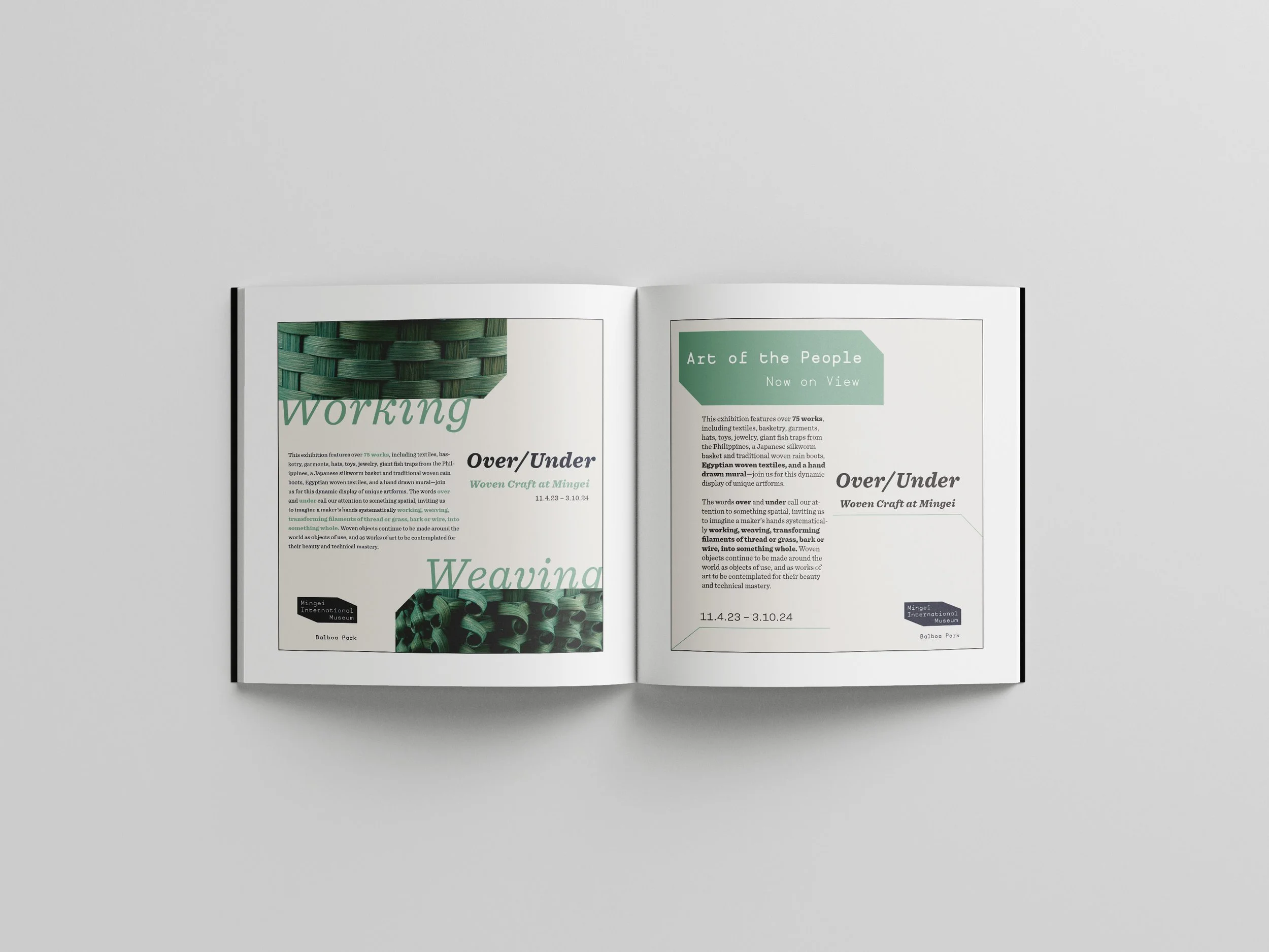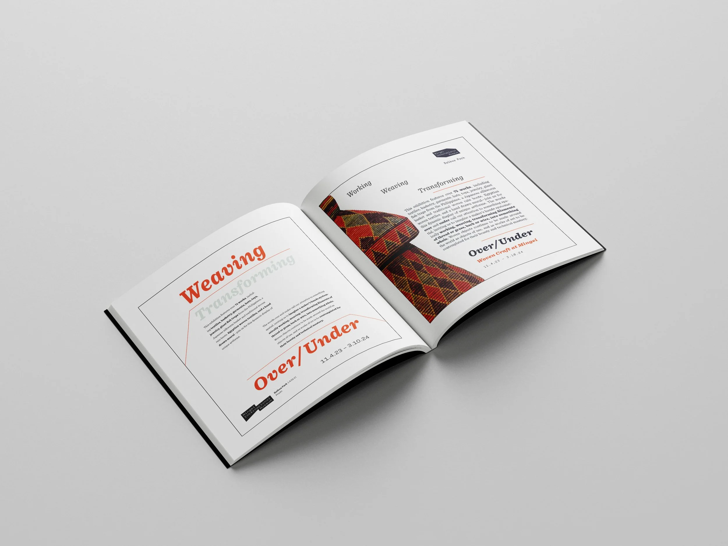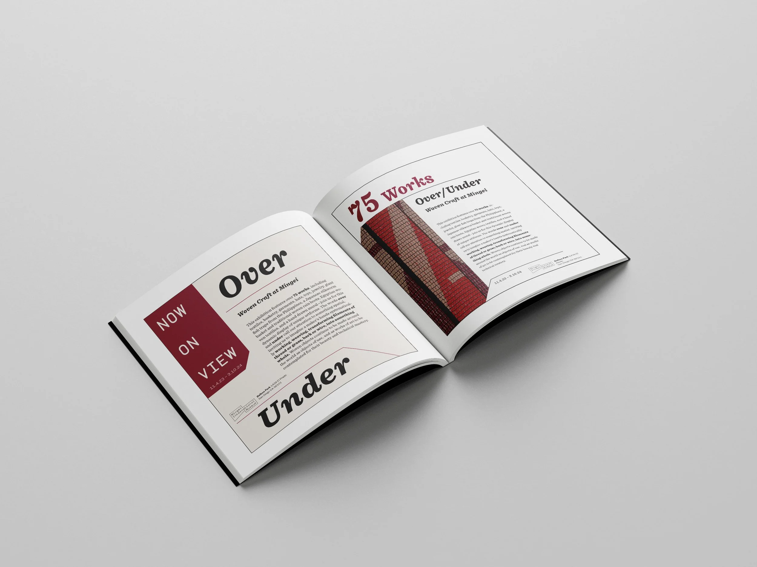 This project focused on designing typography layouts for a new exhibit at the Mingei Museum in Balboa Park. The designs were inspired by weaving, the exhibit's main theme, and followed the museum's design guidelines to reflect its aesthetics. My goal was to create layouts with a sense of movement and incorporate the exhibit's primary colors.